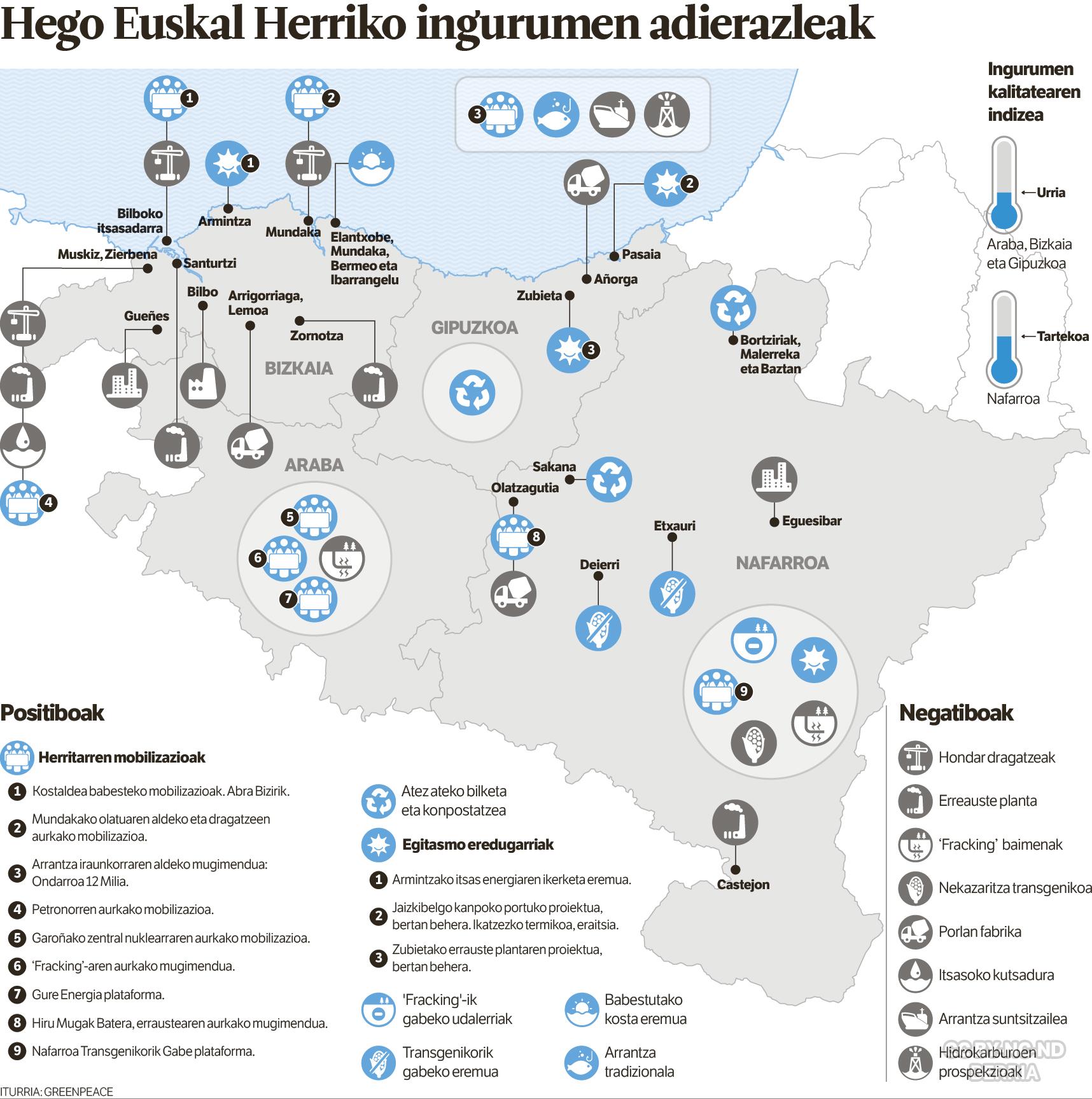 Ingurumenaren kalitatearen indizea urria da Euskal Autonomia Erkidegoan, eta erdi mailakoa Nafarroan, Greenpeacek egindako Ingurumenaren Erradiografia Sozialaren Txostenaren arabera. Gipuzkoako eta Nafarroako hainbat herritan ezarritako hondakinen gaikako bilketa «eredugarritzat» jo du erakunde ekologistak, eta gizarteak fracking-aren aurka azaldutako jarrera txalotu du. Aldiz, gogorarazi du Petronor «hondamendi bat» dela ingurumenarentzat eta euskal kostaldearentzat, eta «arriskuan ipintzen» duela pertsonen osasuna.